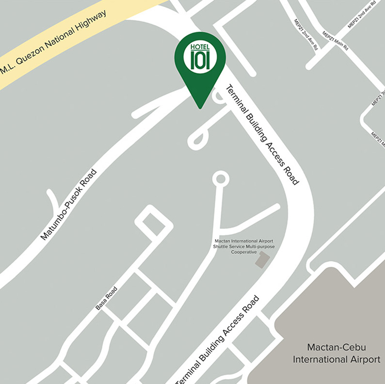 Hotel 101 - Cebu is located in a 5,493 square meter prime commercial lot along the Cebu Mactan Airport terminal Road near Mactan Marina Mall.